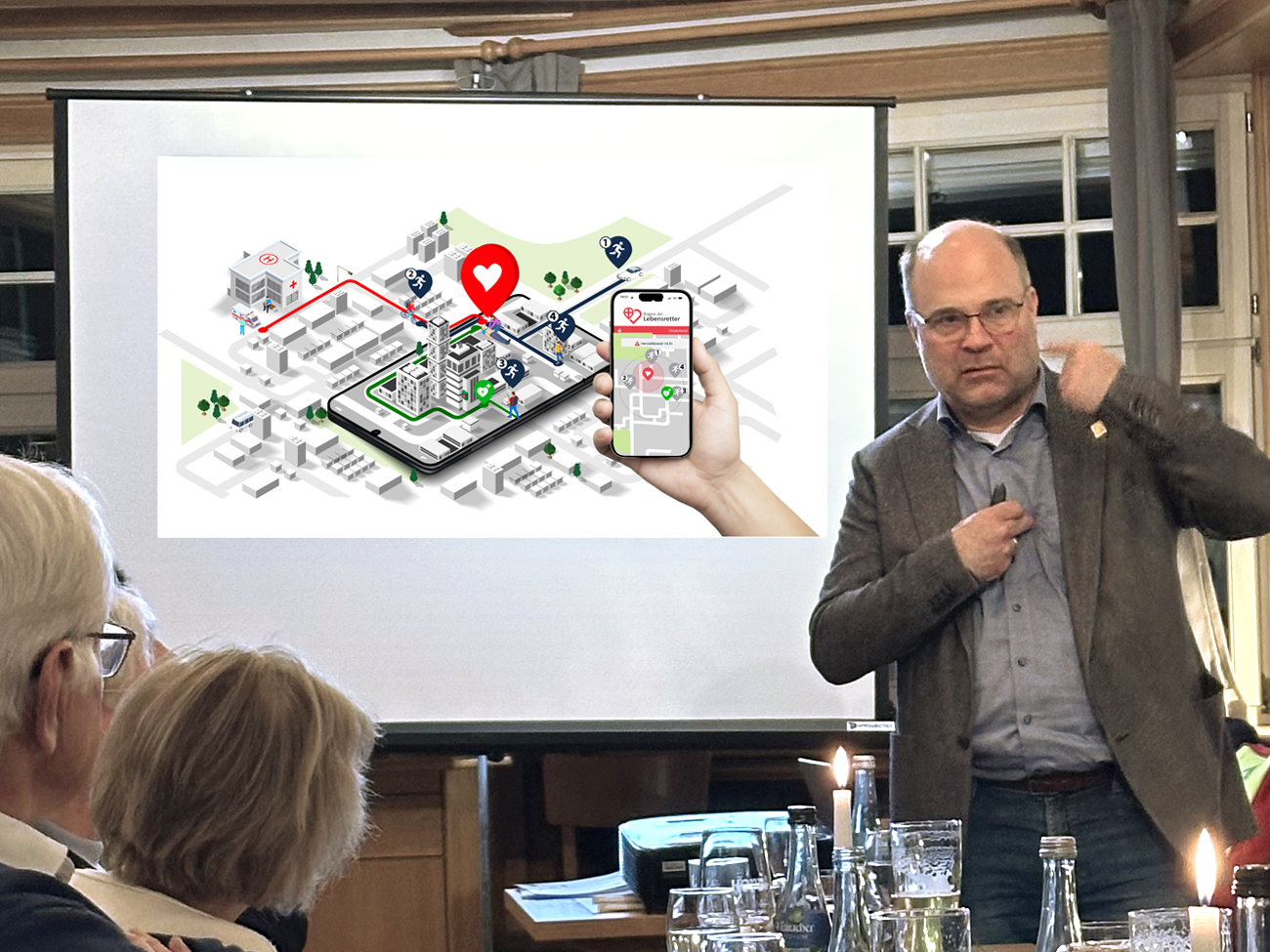 Prof. Müller hält einen detaillierten und sehr engagierten Vortrag über die Bekämpfung von Herzstillständen, gibt einen Überblick über die Situation insbesondere in Baden-Württemberg und stellt den Verein “Region der Lebensretter” vor, der durch den Einsatz von ausgebildeten freiwilligen Helfern (Sanitäter, Krankenschwerstern) den Rettungsdienst ergänzen und Leben retten kann, spricht über Defibrillatoren und über politische Hemnisse z.B. durch das Rettungsdienstgesetz in Baden-Württemberg.